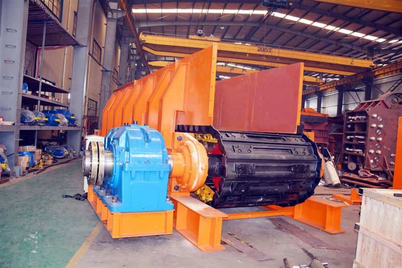 采用節距為228.6mm(9吋)的高強度推土機模鍛鏈條為牽引件,兩根鏈條繞過安裝在機體頭部的一對驅動鏈輪和機體尾部的一對張緊輪聯成封閉形回路,在兩排鏈條的每個鏈節上裝配了相互交迭的、重型結構的輸送槽而成為一個連續的能夠運載物料的輸送線路。其自重和物料的重量由安裝在機體上的多排支重輪、鏈托輪和滑道梁支承。傳動系統經交流變頻調速電動機聯接減速機,再由漲套與驅動裝置直聯驅動運載機構低速運行。將尾部料倉卸入的物料沿輸送線路運至機體的前方排出,實現向下方的工作機械連續均勻喂料的目的。