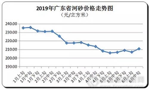 6月中旬,全省河砂平均購進價為每立方米211元,環比上升1.86%(與2019年6月上旬相比,下同)。其中,粵北和珠三角地區購進價分別為每立方米215元和199元,環比上升0.62%和6.55%?;浳骱突洊|地區價格環比持平。