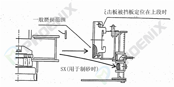 注:反擊板可按照下列步驟對反擊板進行向上/向下運動進行更換,見圖二:反擊板磨損圖